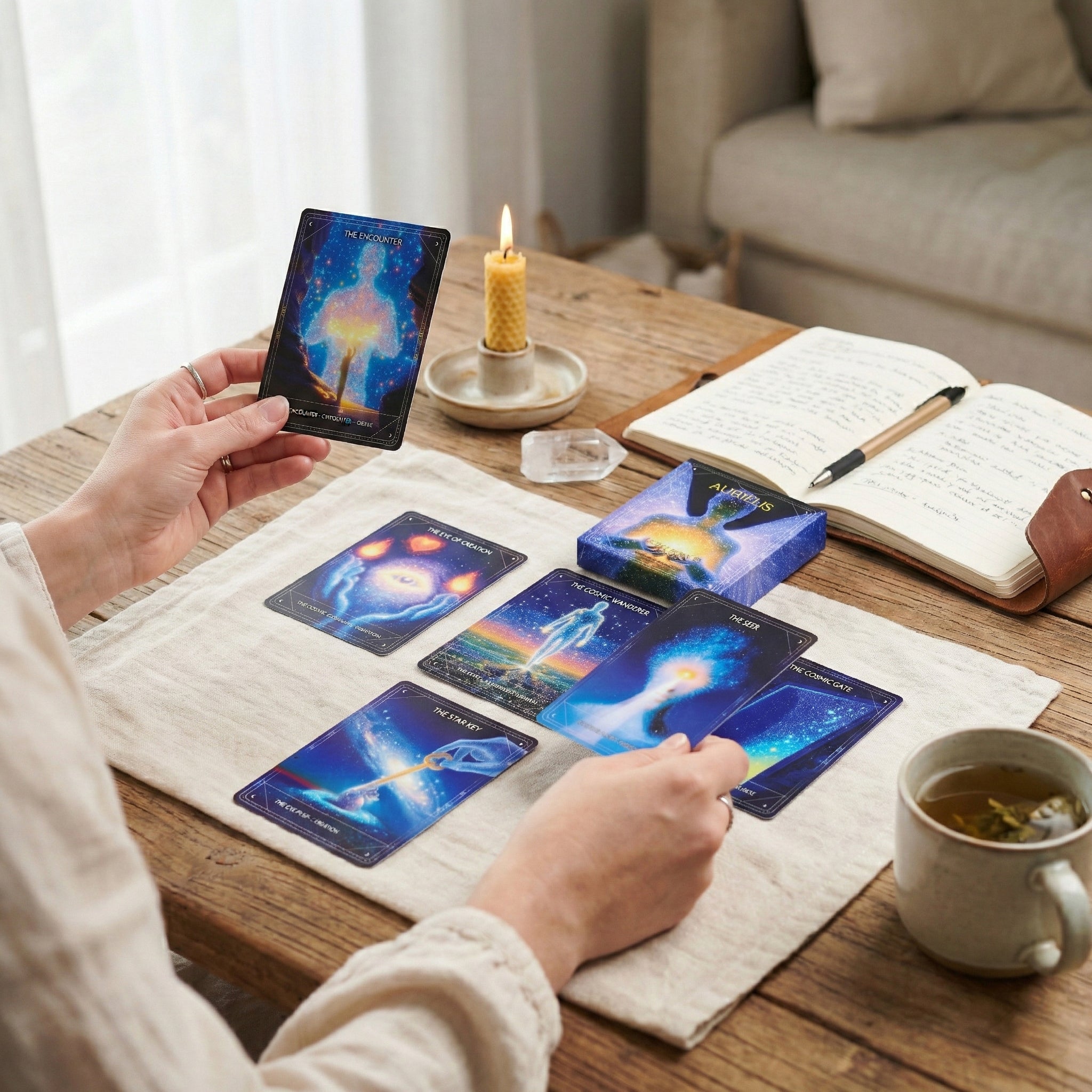 I created and curated from thousands of images, not to chase aesthetic variety, but to build coherence: recurring themes, emotional patterns, decision points, inner contradictions, the quiet moments where we return to ourselves. The goal wasn’t to make something mystical. The goal was to make something useful—a deck that can help you name what’s happening internally, so you can respond with more clarity and less reflex.